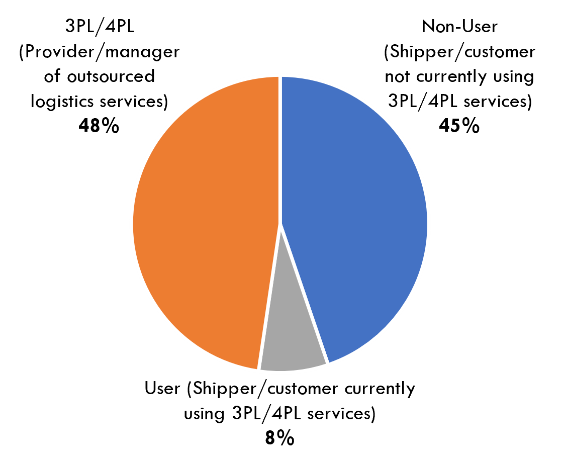 Figure 48 shows the percentage of shipper respondents to the survey, including both users (45%) and non-users (8%) of 3PL services, and the percentage of 3PLs (48%). The non-user responses are helpful because they provide valuable insights on why some organizations have elected not to use 3PLs, as well as non-user perspectives on several other relevant topics throughout the study.