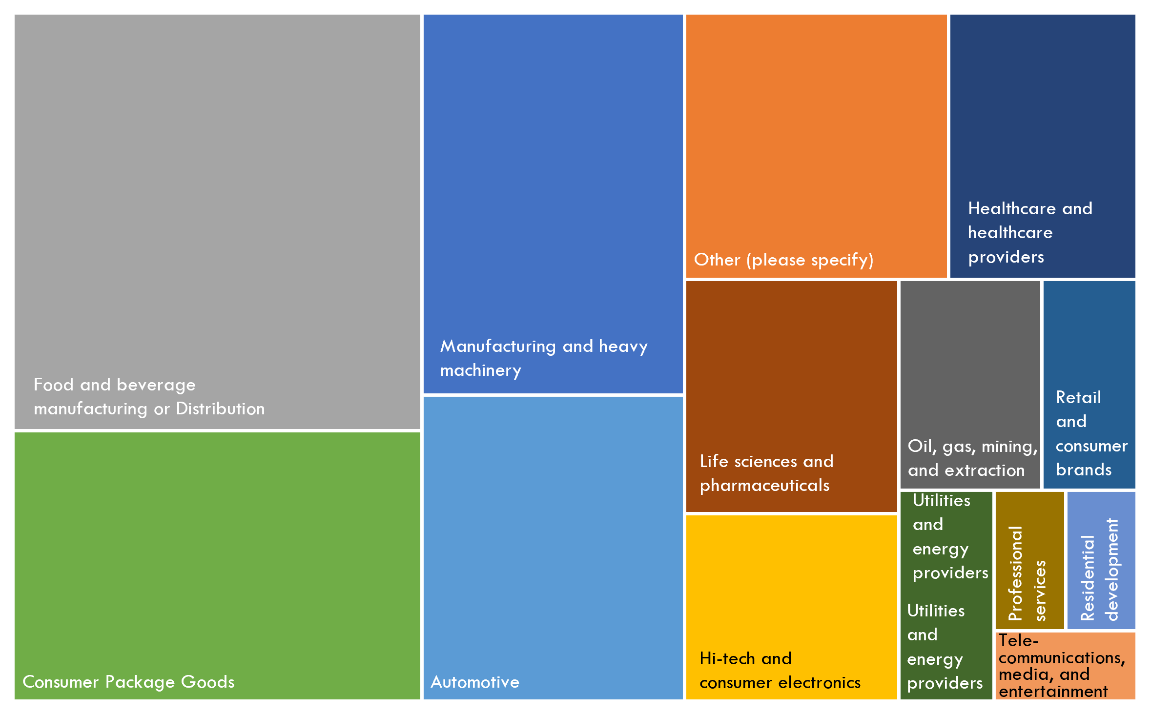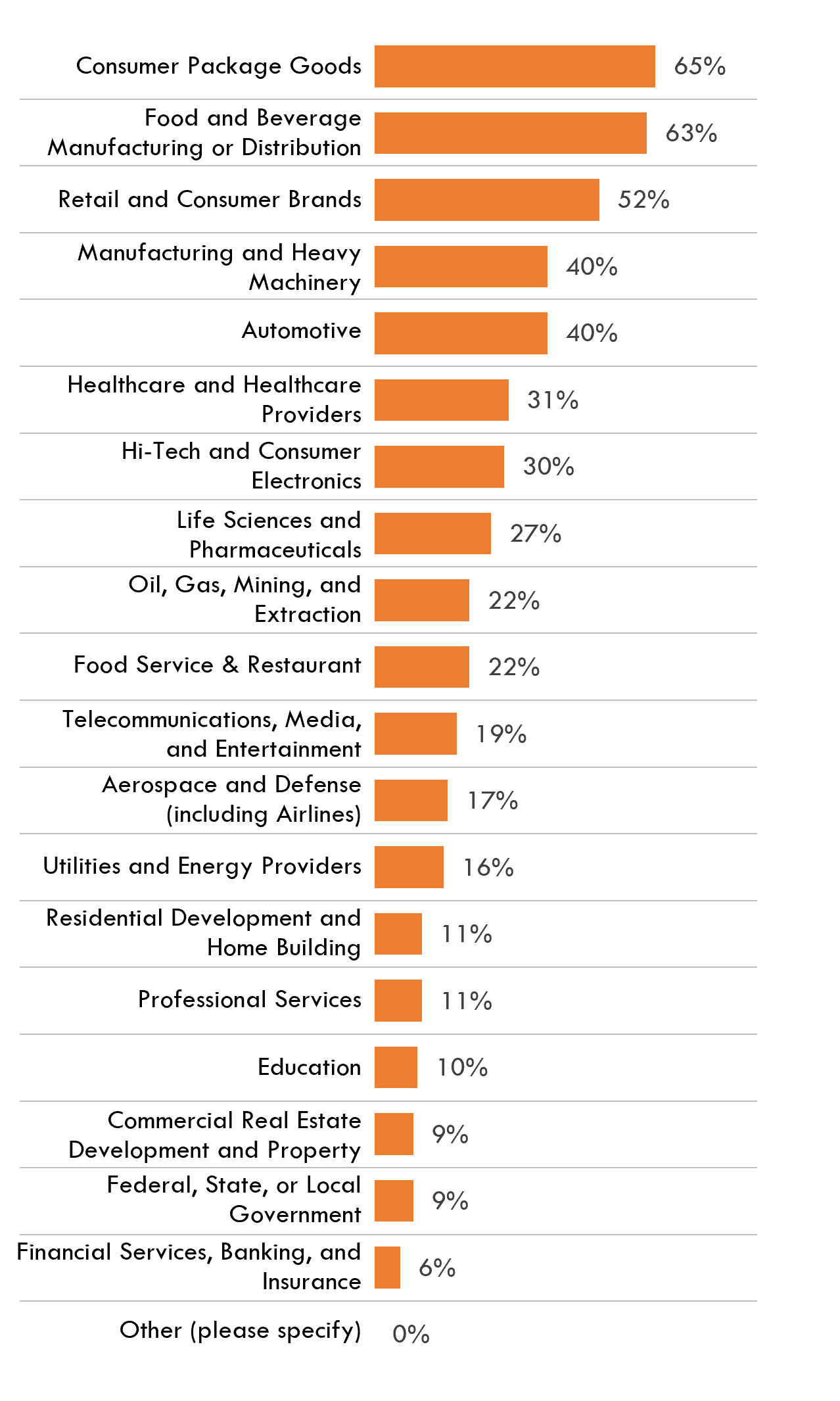 Shipper respondents are typically senior managers, directors, vice presidents and above from a mixture of different industries. Figure 49 shows the 10 most prominent industries reported by users of 3PL services, including food and beverage manufacturing or distribution (22%), CPG (14%), retail and consumer brands (3%), manufacturing and heavy machinery (13%), and automotive (10%).