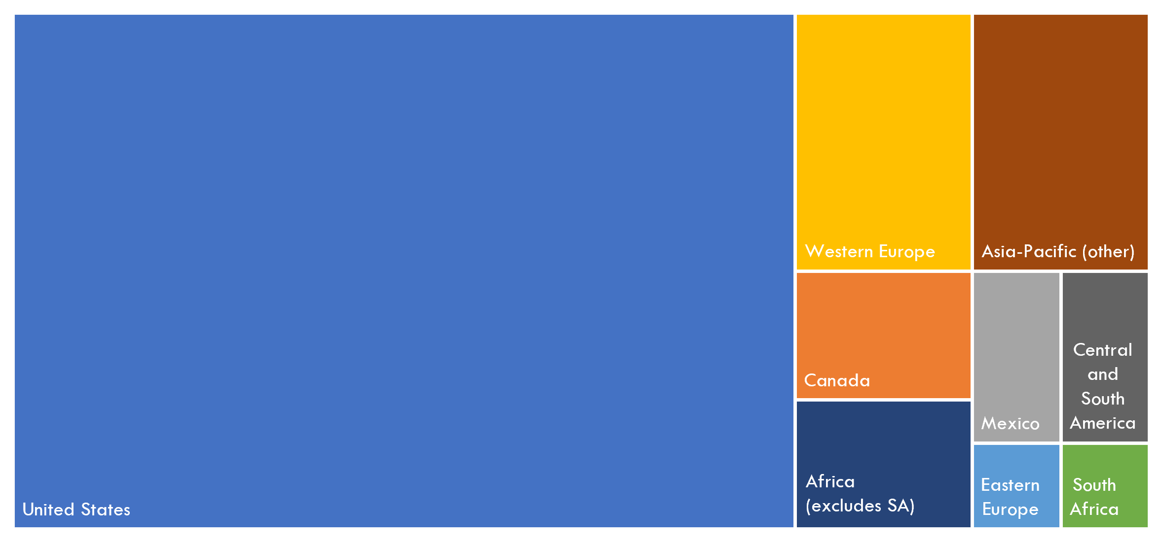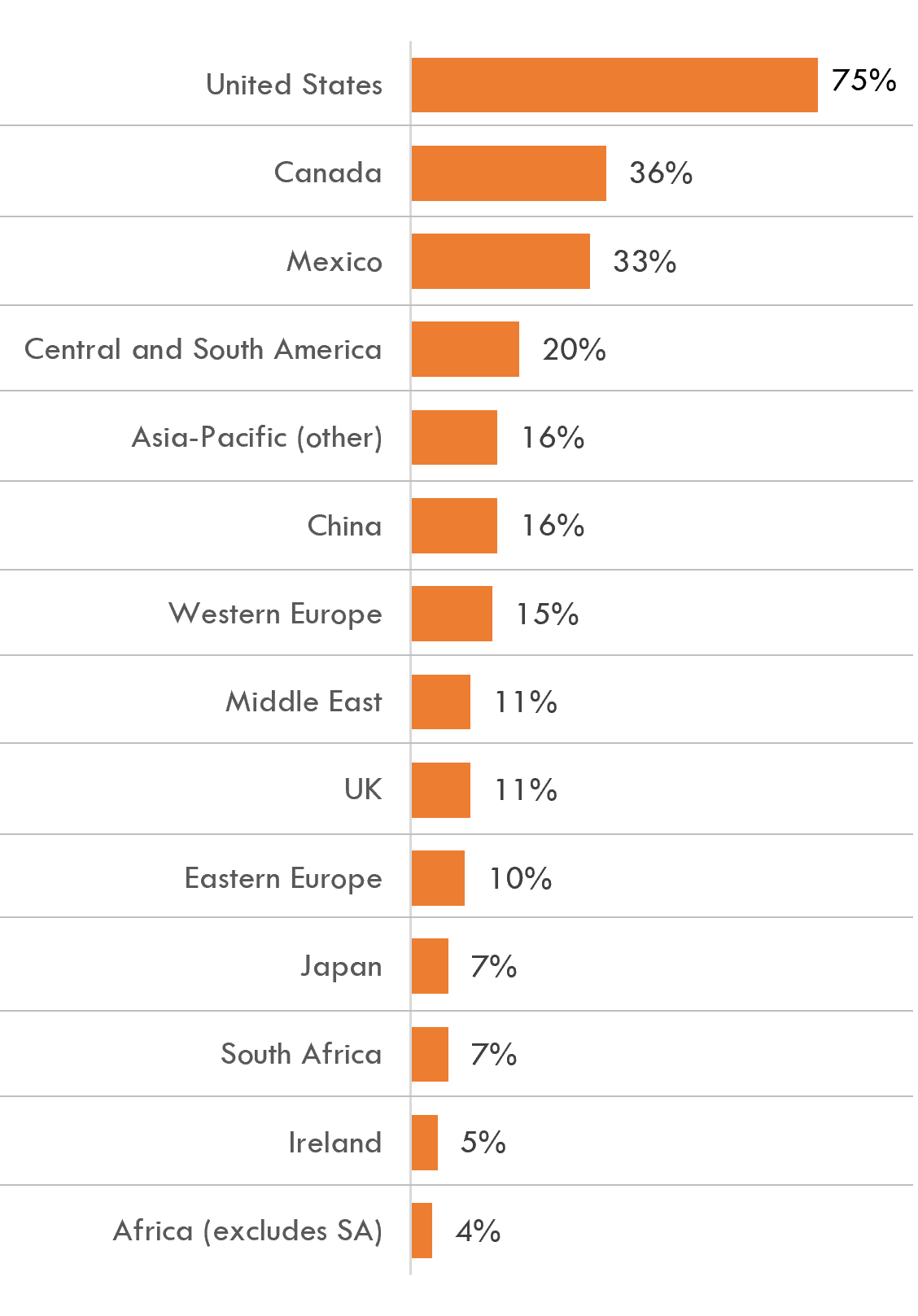 3PL executives and senior leaders responded to a similar, yet separate version of the survey. Since 3PL respondents tend to service multiple geographically areas, the study team asked them to select all major geographies for which they provide service (see Figure 52). North America continues to be the single largest service area at 75%, but all major geographies are represented.